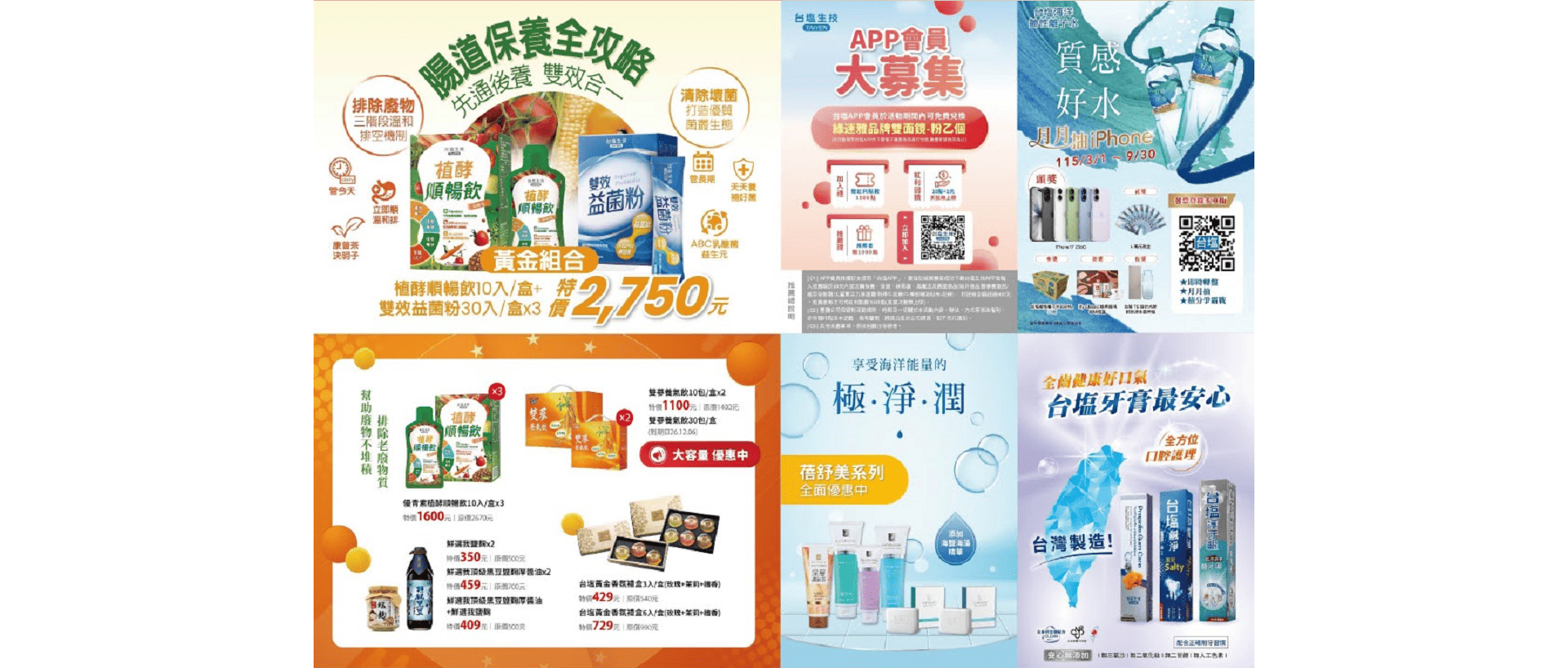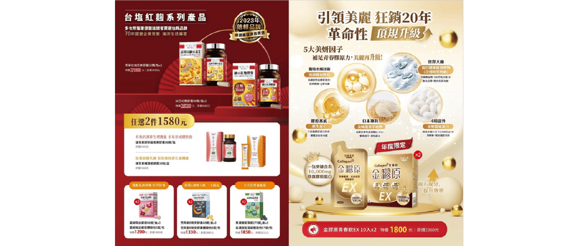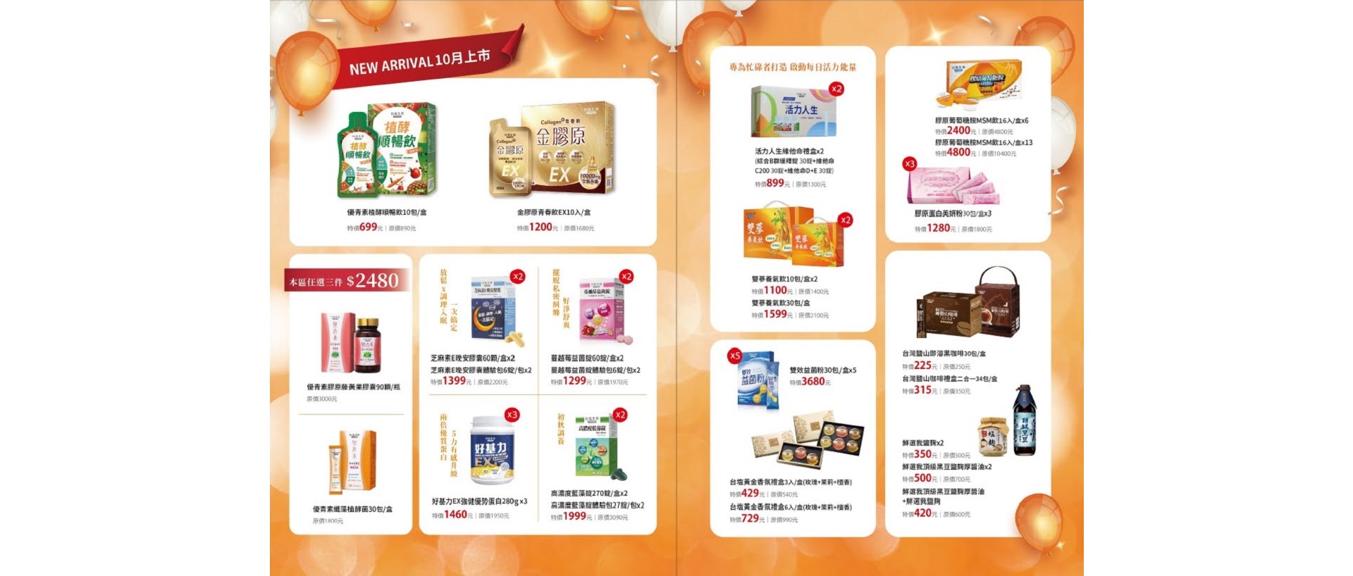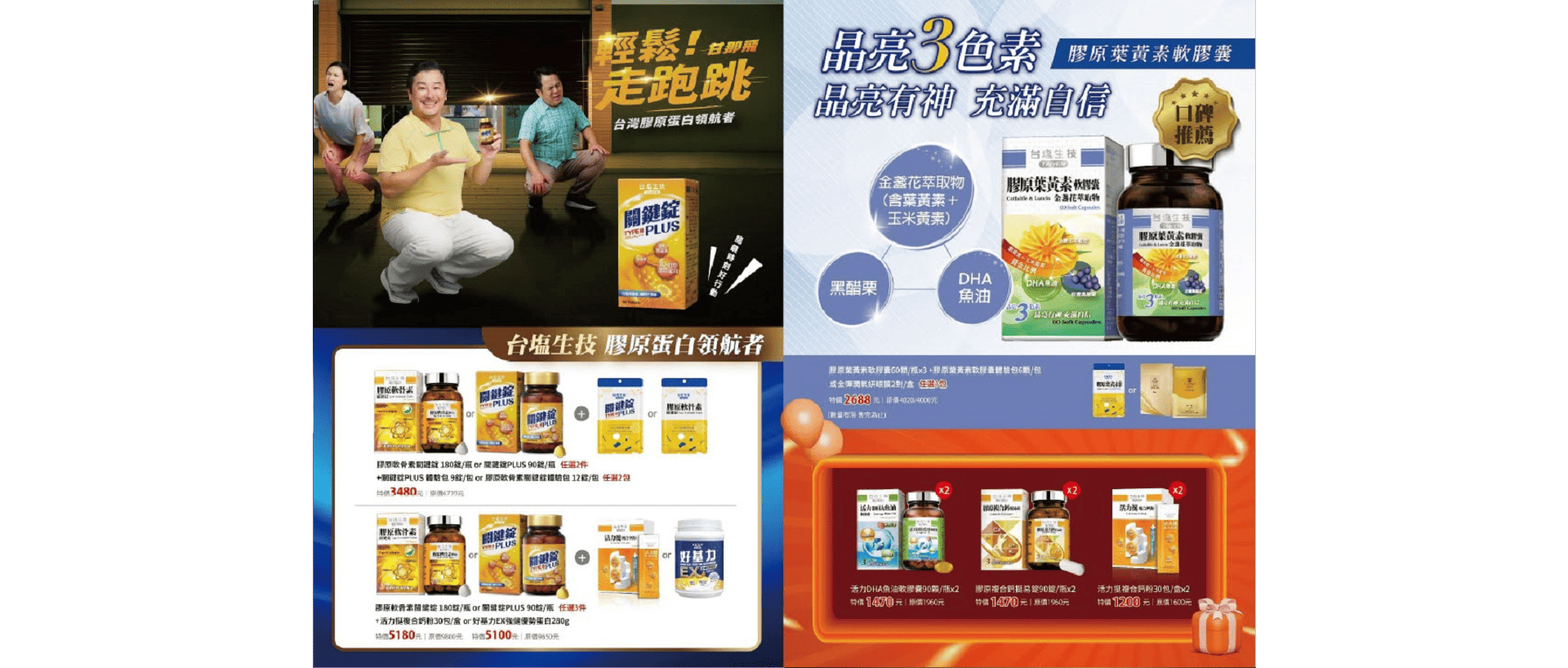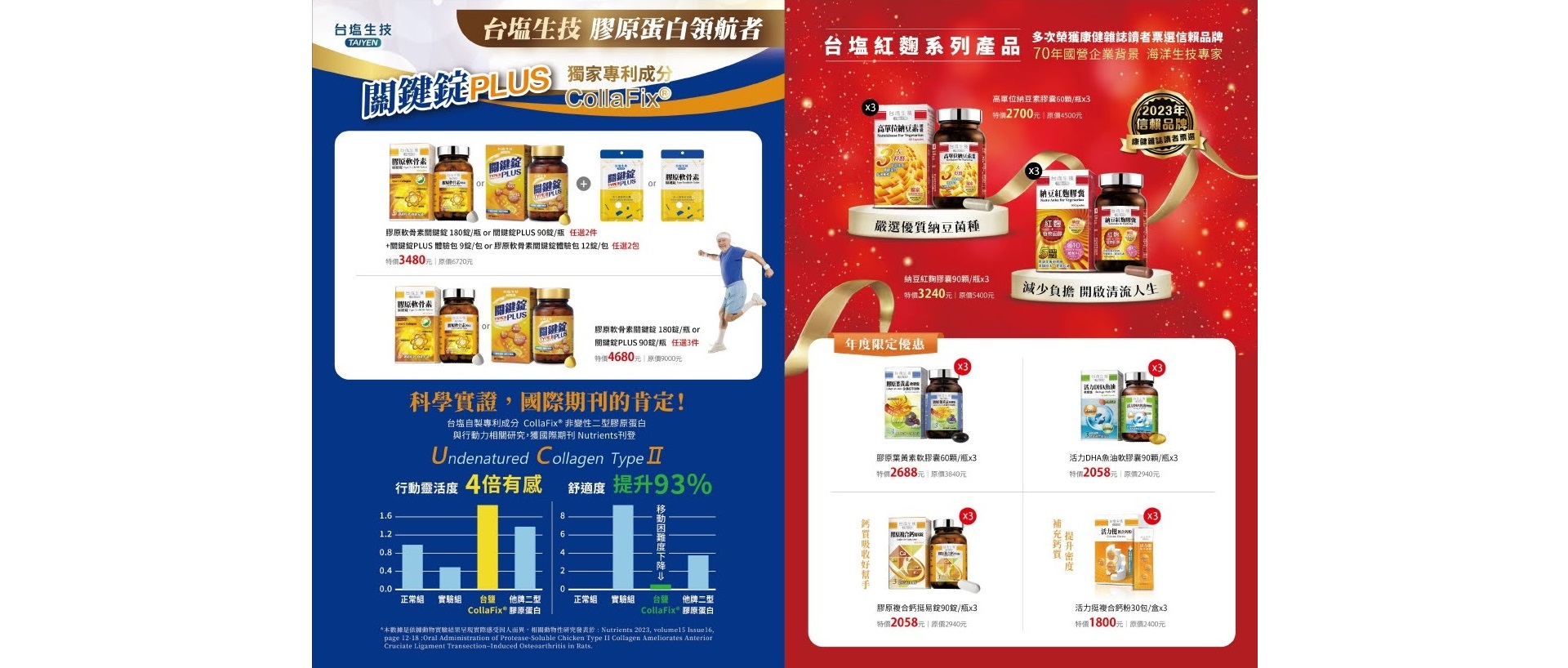 TAIYEN PRODUCT 台塩系列商品介紹 SKIN CARE 保養品 魅力自信 HEALTH CARE 保健產品 健康元氣 CLEANING 清潔用品 潔淨自然 SALT 鹽品 鹽味時尚 PURE AQUA 離子水 海洋活力 HOT PRODUCTS 熱門商品 超進化膠原卸妝露 溫和親膚、高保濕、無油配方,不熏眼、植睫毛可用,含二重浸透卸妝劑與卡帕淨膚藻,只要輕柔按摩30秒就能帶走髒污、卸除臉部彩妝。 超進化膠原卸妝露 溫和親膚、高保濕、無油配方,不熏眼、植睫毛可用,含二重浸透卸妝劑與卡帕淨膚藻,只要輕柔按摩30秒就能帶走髒污、卸除臉部彩妝。 售價:$1000特價:NT$900 詳細介紹 金彈潤輕透防曬乳SPF50+ ★★★ 全光譜防曬概念,打造全方位對抗光老化對策,輕鬆一抹形成UV保護傘,質感輕透舒適,有效保護肌膚避免紫外線傷害、預防曬斑、皺紋產生。 金彈潤輕透防曬乳SPF50+ ★★★ 全光譜防曬概念,打造全方位對抗光老化對策,輕鬆一抹形成UV保護傘,質感輕透舒適,有效保護肌膚避免紫外線傷害、預防曬斑、皺紋產生。 售價:$950特價:NT$950 詳細介紹 超逆引白金撫紋眼霜 輕輕一抹,迅速緊緻眼周線條,讓雙眼遠離老化,隨時電力滿格! 超逆引白金撫紋眼霜 輕輕一抹,迅速緊緻眼周線條,讓雙眼遠離老化,隨時電力滿格! 售價:$2000特價:NT$1,800 詳細介紹 多胜肽撫紋面膜 專利三胜肽能撫平細紋,微蘭藻及木槿萃取能幫助肌膚進行修復。 多胜肽撫紋面膜 專利三胜肽能撫平細紋,微蘭藻及木槿萃取能幫助肌膚進行修復。 售價:$399特價:NT$175 詳細介紹 勁鋼狼神攝膠囊 魅力 BC-5a 補能量 Tri-MACA 好衝勁 L-Arg Polyphenols 勁鋼狼神攝膠囊 魅力 BC-5a 補能量 Tri-MACA 好衝勁 L-Arg Polyphenols 售價:$2500特價:NT$574 詳細介紹 膠原美研沐浴乳 特殊渠水微酸性配方,與肌膚相近酸鹼值,珍貴膠原蛋白賦活因子溫和洗淨,細緻泡沫深入溶解污垢與油脂,清除老廢角質,洗後肌膚滋潤光滑 膠原美研沐浴乳 特殊渠水微酸性配方,與肌膚相近酸鹼值,珍貴膠原蛋白賦活因子溫和洗淨,細緻泡沫深入溶解污垢與油脂,清除老廢角質,洗後肌膚滋潤光滑 售價:$249特價:NT$190 詳細介紹 台塩海洋鹼性離子水-850ml 來自海洋的甘甜好水,無可取代,天天加鹼 好平衡! 台塩海洋鹼性離子水-850ml 來自海洋的甘甜好水,無可取代,天天加鹼 好平衡! 售價:$29特價:NT$29 詳細介紹 關鍵錠PLUS 國際肯定 銷售破億 連續三年榮獲國家品質獎,及歐洲品質獎殊榮 高濃度薑黃,增強體力與補給流失,幫助健康維持,是行動保健的關鍵良伴 關鍵錠PLUS 國際肯定 銷售破億 連續三年榮獲國家品質獎,及歐洲品質獎殊榮 高濃度薑黃,增強體力與補給流失,幫助健康維持,是行動保健的關鍵良伴 售價:$3000特價:NT$1,750 詳細介紹 金彈潤10X賦活安瓶 7天密集修復,煥然一新青春光采 金彈潤10X賦活安瓶 7天密集修復,煥然一新青春光采 售價:$988特價:NT$988 詳細介紹 金彈潤水感護唇膏 添加乳木果油的潤唇膏,以高貴奢華的晶透光澤,打造澎潤雙唇 金彈潤水感護唇膏 添加乳木果油的潤唇膏,以高貴奢華的晶透光澤,打造澎潤雙唇 售價:$600特價:NT$600 詳細介紹 膠原水潤美手霜 專為熟齡手開發的美手霜,搭配乳油木果與荷荷巴油,針對乾燥缺水肌深層修復、強化屏障。 膠原水潤美手霜 專為熟齡手開發的美手霜,搭配乳油木果與荷荷巴油,針對乾燥缺水肌深層修復、強化屏障。 售價:$550特價:NT$550 詳細介紹 金彈潤氧妍Q膜 Q彈膜力新肌,喚醒青春原動力 金彈潤氧妍Q膜 Q彈膜力新肌,喚醒青春原動力 售價:$600特價:NT$600 詳細介紹 金彈潤煥顏霜 十萬顆活性因子,瞬時煥顏 金彈潤煥顏霜 十萬顆活性因子,瞬時煥顏 售價:$2580特價:NT$2,580 詳細介紹 金彈潤晶露 賦予新生能量,啟動年輕關鍵 金彈潤晶露 賦予新生能量,啟動年輕關鍵 售價:$1980特價:NT$1,980 詳細介紹 膠原葉黃素軟膠囊 金盞花萃取物 晶亮三色素-金盞花萃取物(葉黃素+玉米黃素)、黑醋栗、DHA魚油,全方位營養補充,為您創造寬廣新適界 膠原葉黃素軟膠囊 金盞花萃取物 晶亮三色素-金盞花萃取物(葉黃素+玉米黃素)、黑醋栗、DHA魚油,全方位營養補充,為您創造寬廣新適界 售價:$1280特價:NT$1,152 詳細介紹 活力DHA魚油軟膠囊 以特殊製程提煉出高濃度DHA及低含量EPA的魚油,小顆粒軟膠囊易吞食是呵護全家的聰明成分,讓您充分掌握最佳關鍵黃金時期 活力DHA魚油軟膠囊 以特殊製程提煉出高濃度DHA及低含量EPA的魚油,小顆粒軟膠囊易吞食是呵護全家的聰明成分,讓您充分掌握最佳關鍵黃金時期 售價:$980特價:NT$882 詳細介紹 金盞花葉黃素EX+膠囊 10:2葉黃素及玉米黃素 珍貴蝦紅素 專利葡萄籽 金盞花葉黃素EX+膠囊 10:2葉黃素及玉米黃素 珍貴蝦紅素 專利葡萄籽 售價:$1980特價:NT$680 詳細介紹 高濃度藍藻錠 健康維持 平衡代謝 機能調節 高濃度藍藻錠 健康維持 平衡代謝 機能調節 售價:$1380特價:NT$1,242 詳細介紹 攝勁猛HCE複合膠囊 輕鬆暢快,自信幹勁 注入活力,熟男必備 攝勁猛HCE複合膠囊 輕鬆暢快,自信幹勁 注入活力,熟男必備 售價:$2000特價:NT$574 詳細介紹 超進化膠原深層潔顏霜 頂級潔顏配方為日常保養舞出最美麗舒適的序曲,維持肌膚淨、滑、透、亮! 超進化膠原深層潔顏霜 頂級潔顏配方為日常保養舞出最美麗舒適的序曲,維持肌膚淨、滑、透、亮! 售價:$1550特價:NT$1,395 詳細介紹 超進化膠原去角質凝膠 以植物纖維素軟化去除肌膚角質,強化後續保養吸收、修護老化肌膚。 超進化膠原去角質凝膠 
